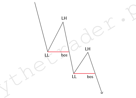 Нисходящий тренд состоит из понижающихся максимумов LH и минимумов LL. Подтверждением LH будет обновление LL.