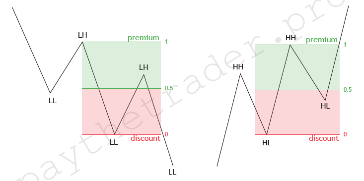После каждого импульса и обновления рыночной структуры смарт мани трейдеры заинтересованы найти точку входа в сделку после возврата цены в зону дискаунта (для лонгов) и премию (для шортов).