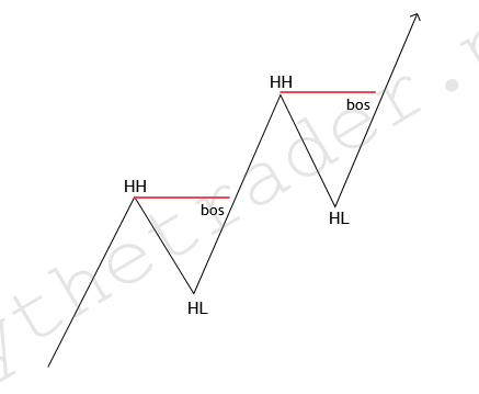 Восходящий тренд состоит из повышающихся максимумов (HH) и минимумов (HL). Подтверждением HL будет обновление HH, где отмечено красной линией bos (break of structure).