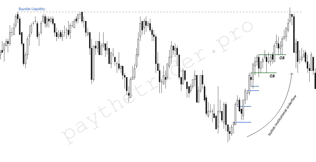 Когда цена достигает зоны интереса, либо снимает ликвидность со стороны покупок (buyside liquidity), начинается разворот тренда либо коррекция.