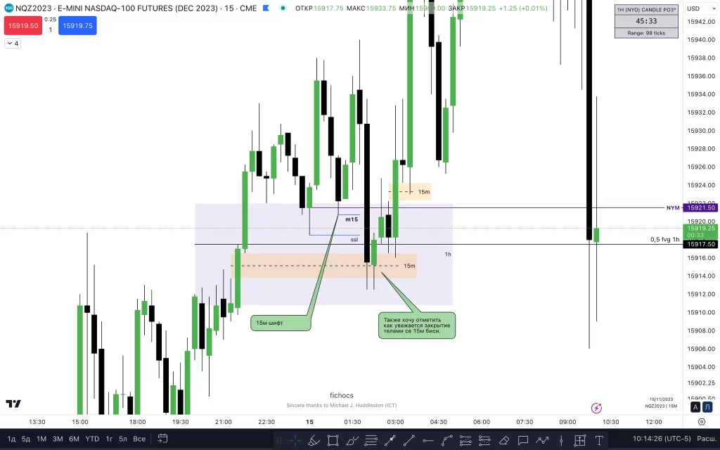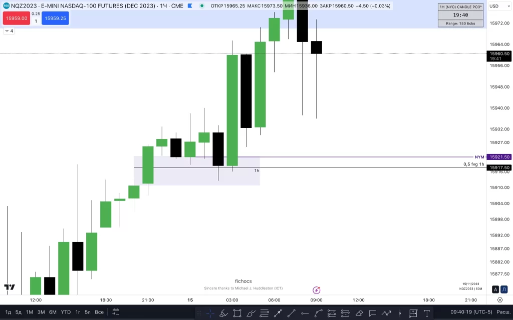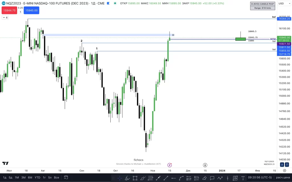 Top-Down анализ подразумевает работу по анатилке старшего таймфрейма постепенно спускаясь к младшему. В этот статье расскажет на что обращать внимание, какие зоны интересы выделять и как происходит эта работа поэтапно. Покажем пример такого анализа от 15 ноября 2023 года, логика любого другого дня будет абсолютно идентична.