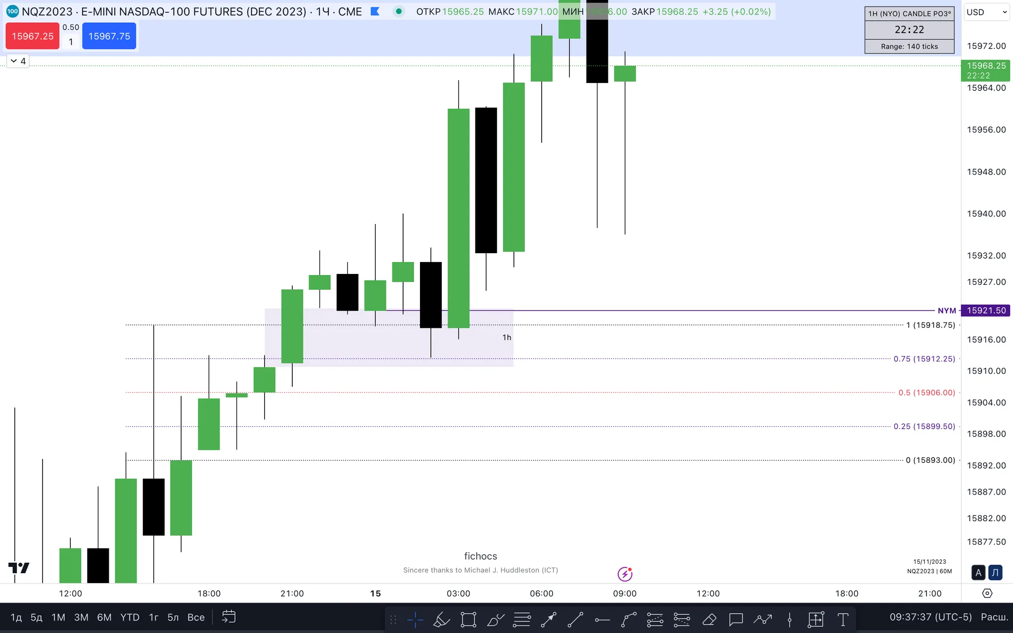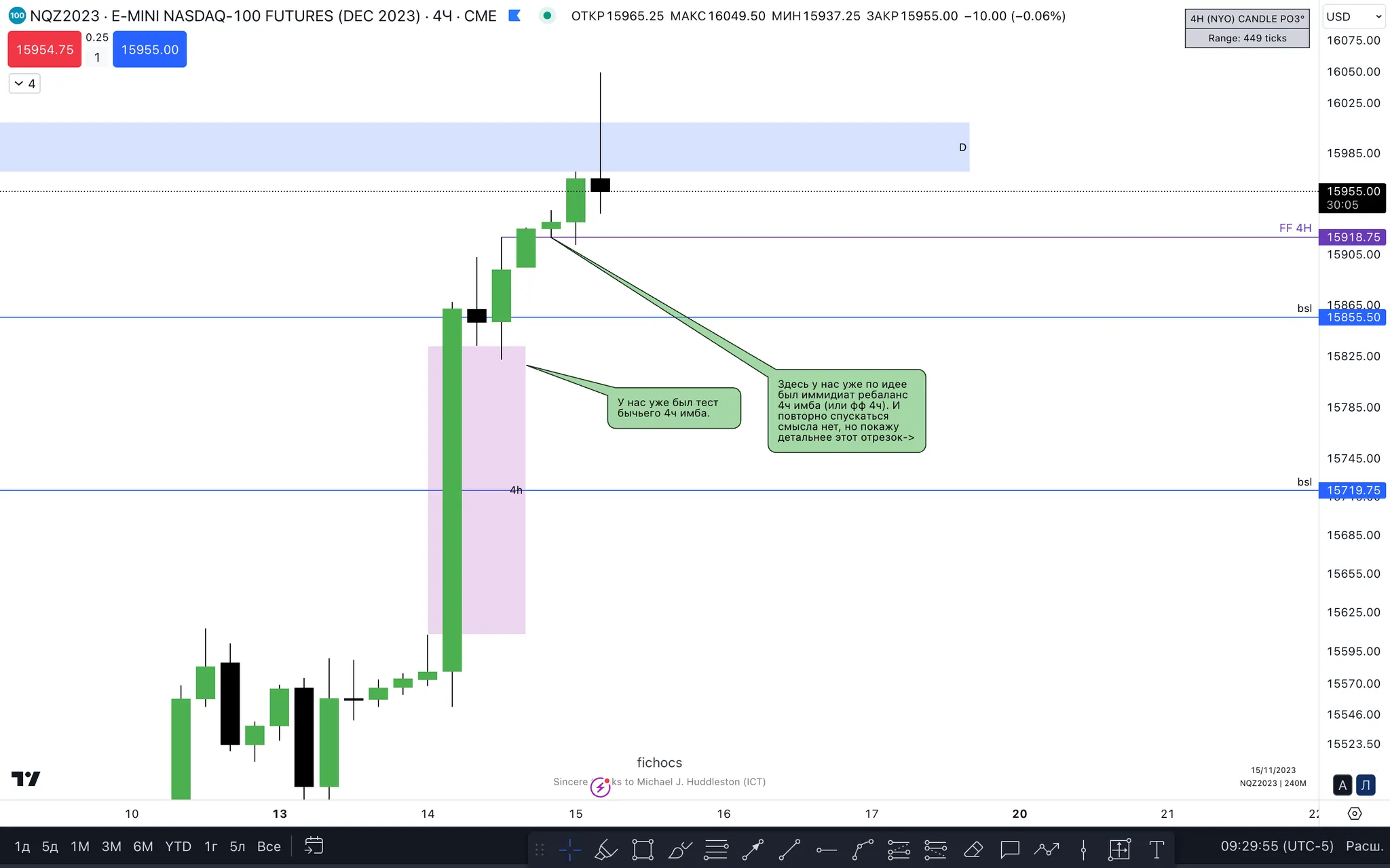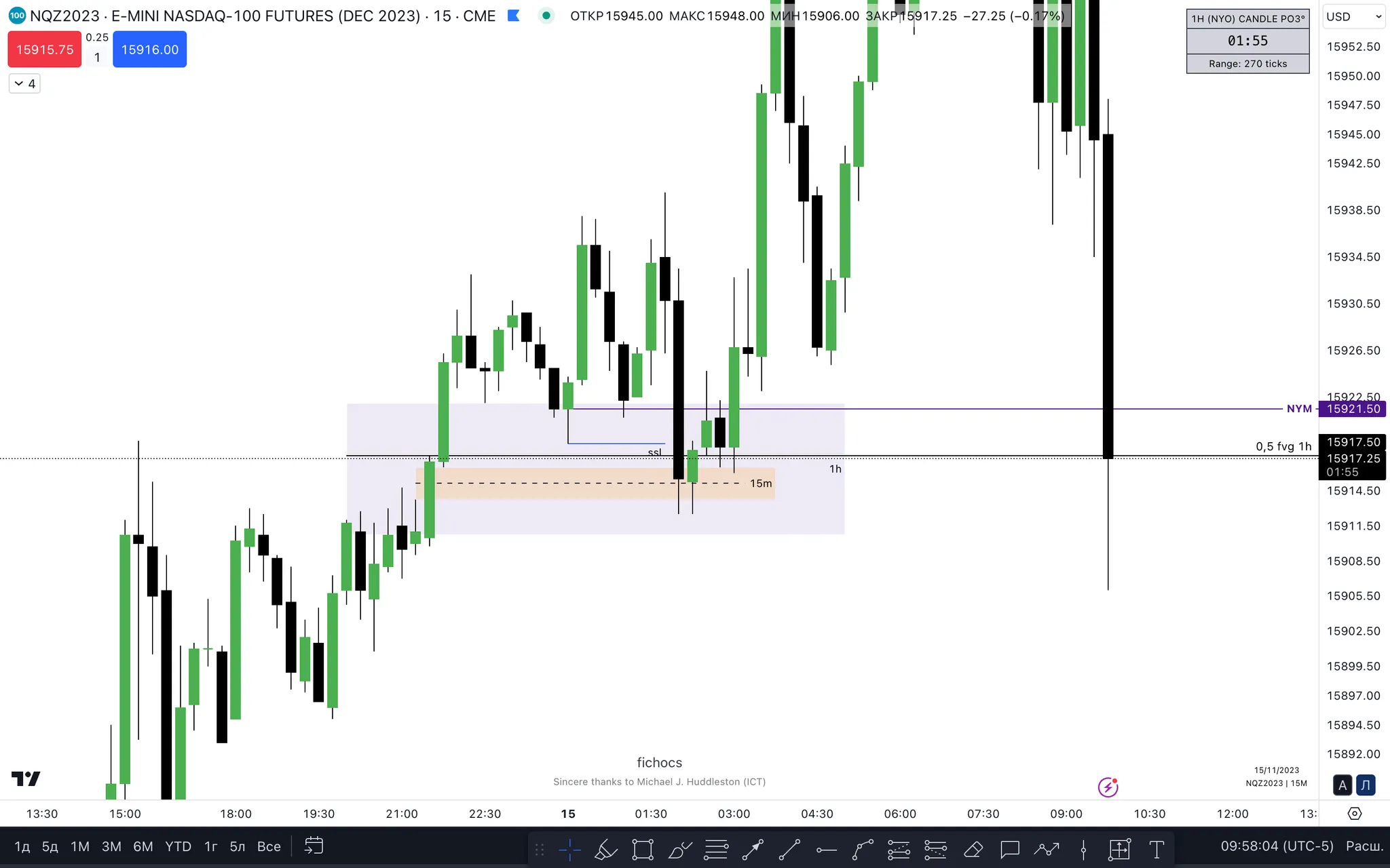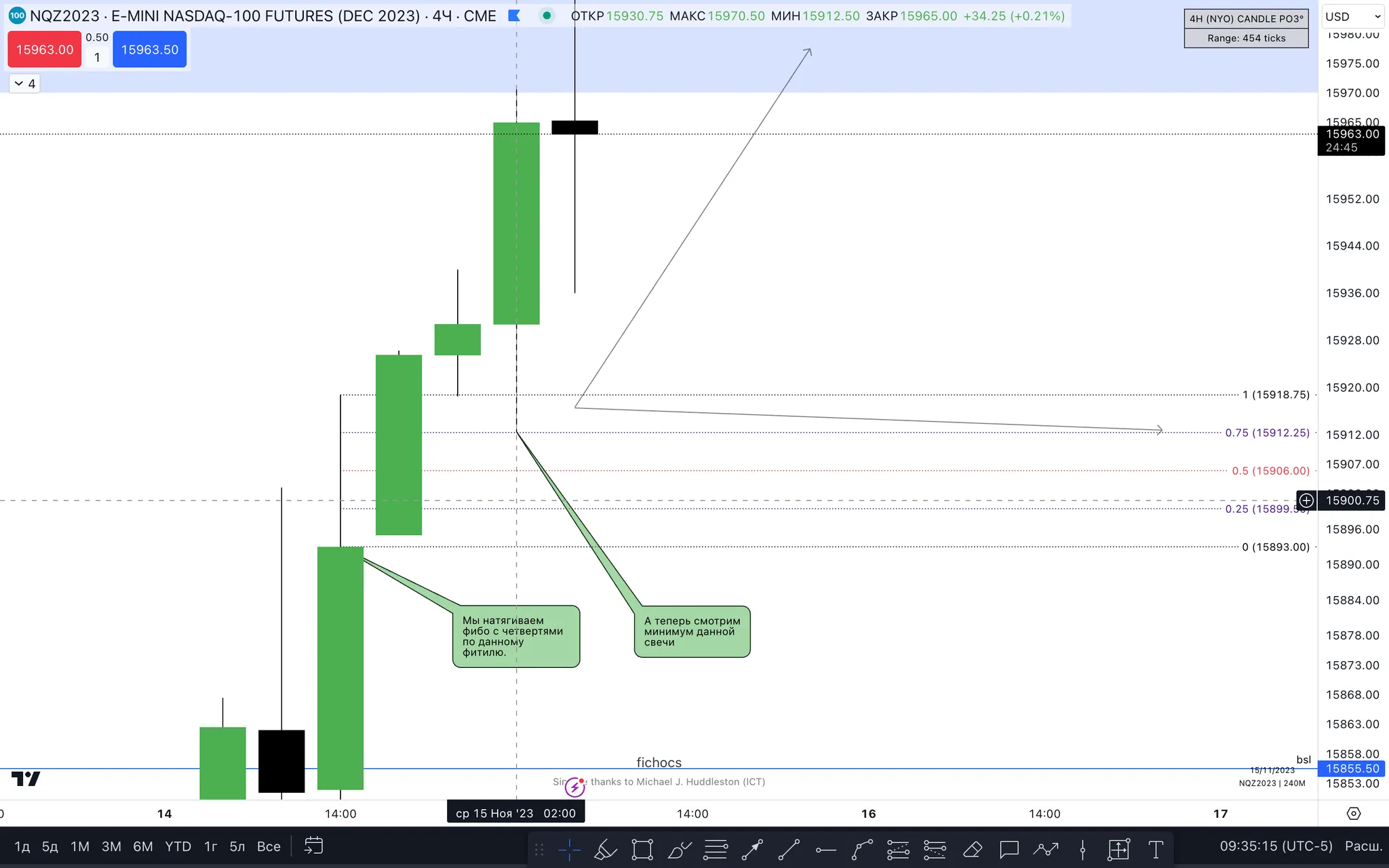 Top-Down анализ подразумевает работу по анатилке старшего таймфрейма постепенно спускаясь к младшему. В этот статье расскажет на что обращать внимание, какие зоны интересы выделять и как происходит эта работа поэтапно. Покажем пример такого анализа от 15 ноября 2023 года, логика любого другого дня будет абсолютно идентична.
