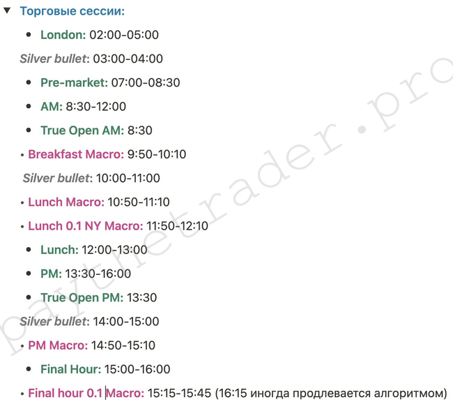 True Open PM: 13:30 Silver bullet: 14:00-15:00, 15:00-16:00 (Final hour) Final hour Macro: 15:15-15:45 (16:15 иногда продлевается алгоритмом) |