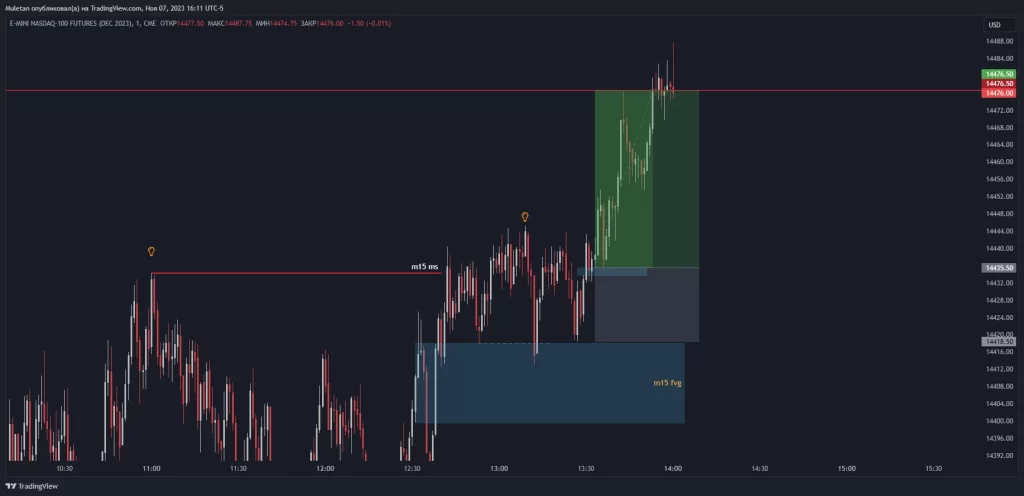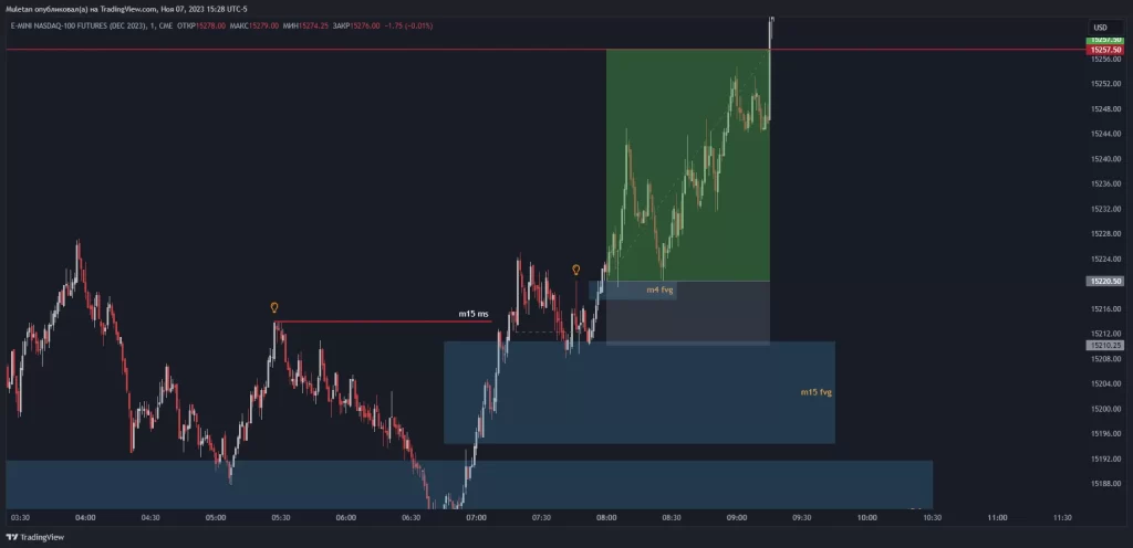 Если все правила соблюдены – можно переключаться на лтф. Я использую м1-м5. Нас интересует поведение цены в зоне снятия внутренней ликвидности и теста м5/м15 имбаланса (желтый квадрат).