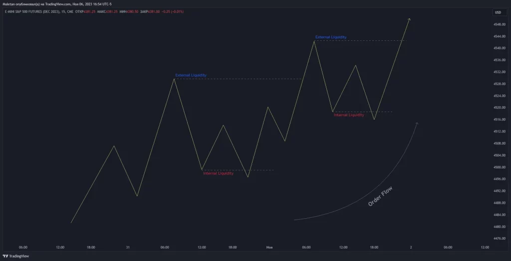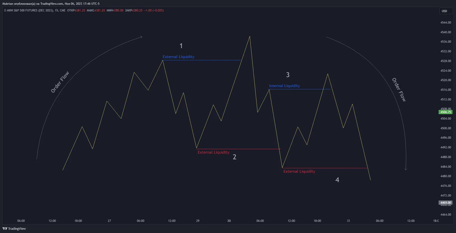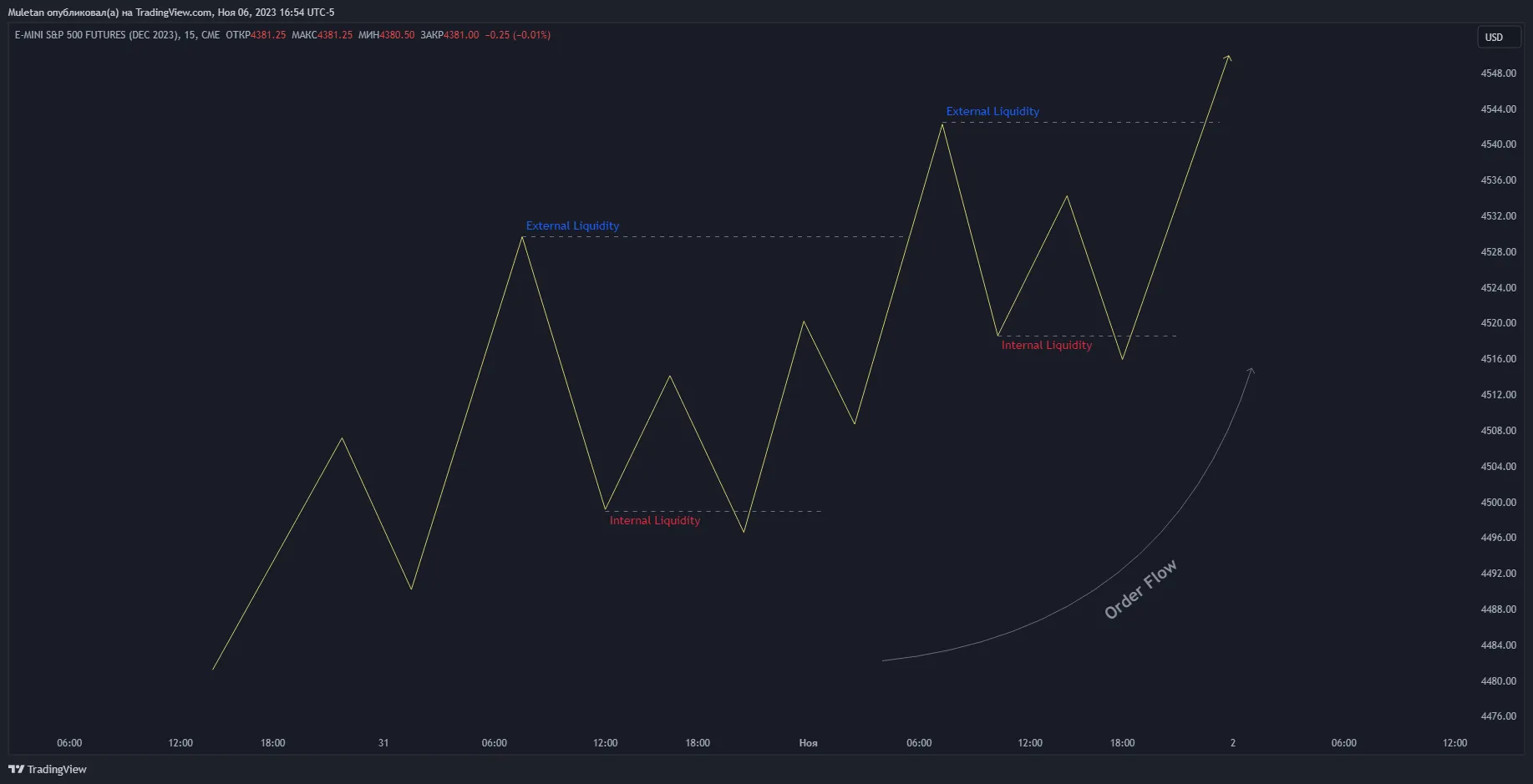 Цена всегда ходит от внутренней ликвидности к внешней, и наоборот, когда движется в одном направлении ордерфлоу. Нам интересно ждать образование сетапа после снятия внутренней ликвидности с целью обновления внешней.
